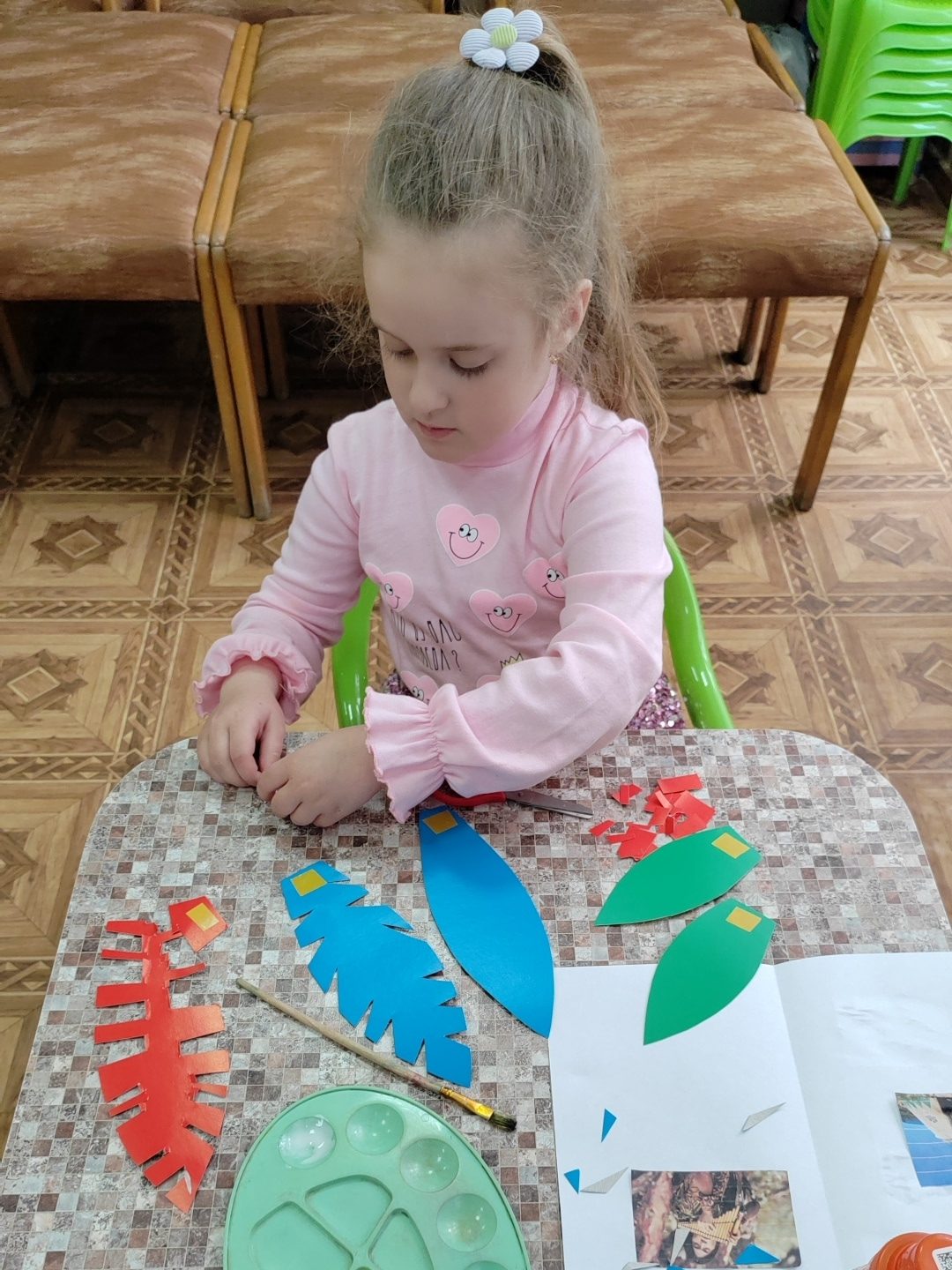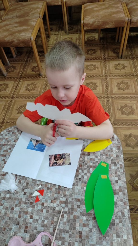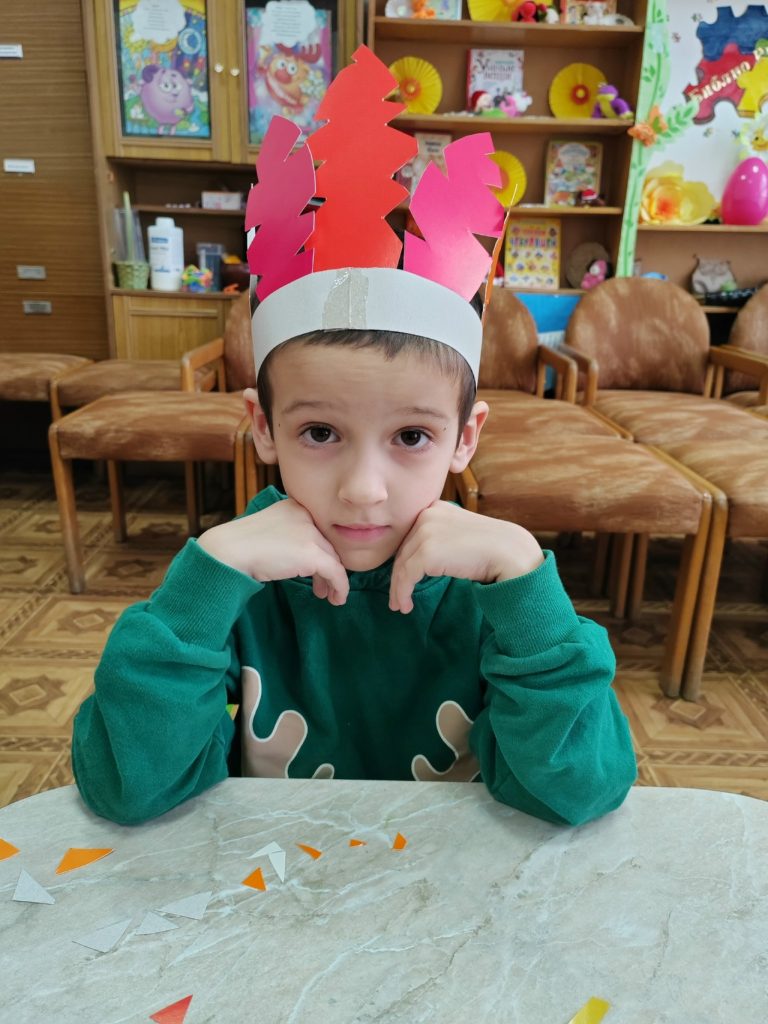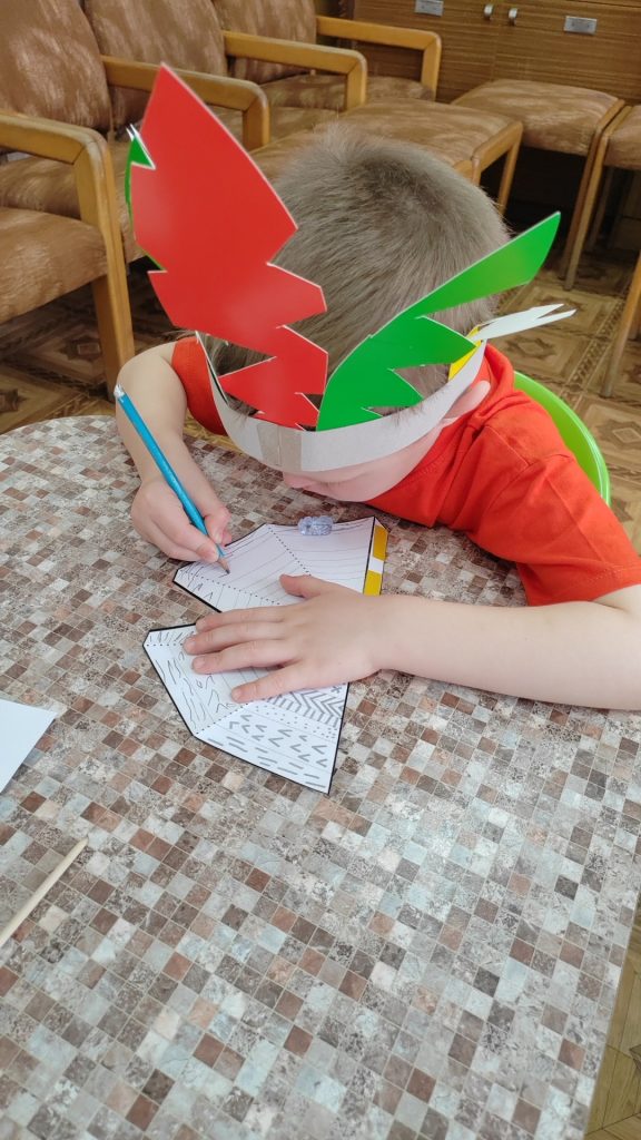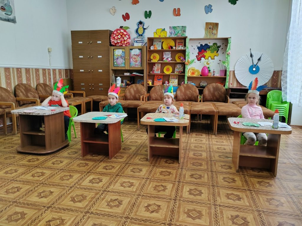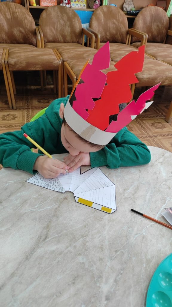 Затем дети превратились в индейцев: они изготовили себе венец из перьев – головной убор североамериканских индейцев, представляющий собой повязку с закрепленными по кругу перьями (надрезали ножницами картонные заготовки в виде перьев и закрепили их на ободке), получили индейские имена и выучили индейское приветствие, сопровождающееся жестами.
