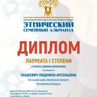 Библиотекарь Заозерской библиотеки-филиала № 31 Пашкевич Людмила Арсеньевна приняла участие в Общероссийском конкурсе «Этнический семейный альманах» 2025 и быланаграждена дипломом лауреата I степени в номинации «Горжусь своими земляками». Конкурс «Этнический семейный альманах» направлен на популяризацию позитивных примеров уклада семьи, сохранение и развитие национальных семейных и родословных традиций, а также укрепление семейных отношений как результата совместной деятельности и передачи семейных традиций