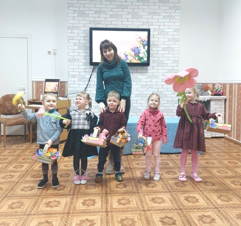 Праздничное занятие прошло в группе «Чтение с пелёнок». Началось занятие с вручения ребятам подарочных коробочек, которые дети украсили сердечками (одно ласковое слово – одно сердечко). Заполняли корзиночку малыши разнообразными подарками, сделанными своими руками. Так, малыши сделали из цветной бумаги букет для мамы, а затем украсили его разнообразными цветками.
