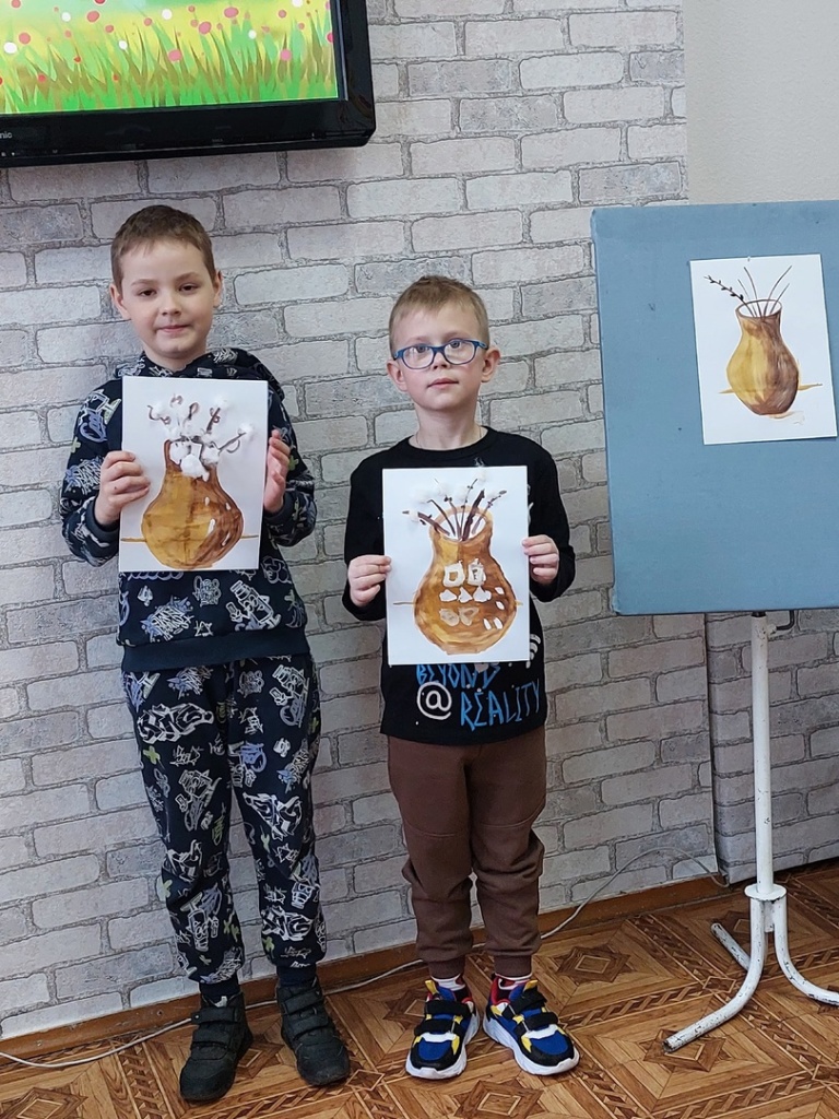 Логическим продолжением занятия стала творческая работа “Рисование с натуры веточек вербы”. Для проведения занятия была организована выставка книг о весне из фонда библиотеки. Закончилось занятие совместным фотографированием с выполненными работами.