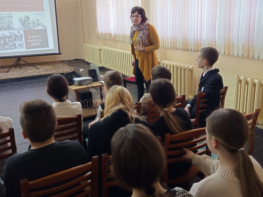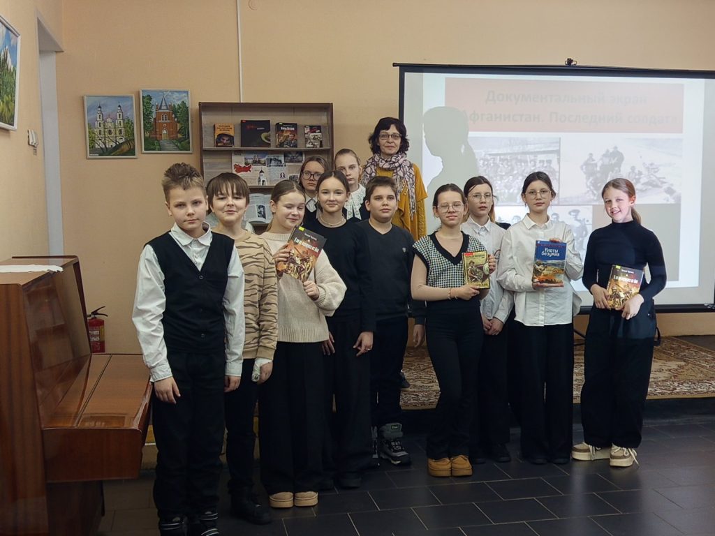 В преддверии этой памятной даты, 12 февраля, в рамках проекта «Найдешь отечество близко» для учащихся 6 «Г» класса государственного учреждения образования «Средняя школа №6 г. Полоцка» проведено информационно-познавательное мероприятие «Афганистан. Последний солдат». Учащиеся посмотрели документальный фильм «Последний солдат». Этот фильм – память о жертвах и героях той войны, о том, как она началась и как закончилась. Девять лет и пятьдесят один день жестоких боёв в чужом краю. Все вместе обсудили просмотренное, порассуждали, разгадали кроссворд на военную тематику, ответили на вопросы викторины и познакомились с литературой, представленной на выставке.